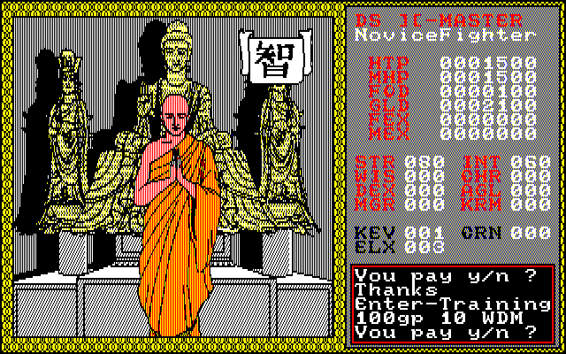 まず城に行って名前を入力します。装備とお金(gold)が貰えます。 このあと各道場を廻ってパラメータを設定していきます。 |