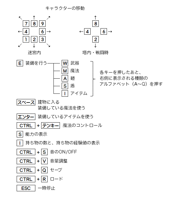 赤文字:名前 戦士の称号 魔法使いの称号 Hit.P:現在の生命力 Max.HP:最大生命力 Gold:所持金 Streng:武器による攻撃力 Magic:魔法による攻撃力 Defend:正面の防御力 STR:攻撃力 INT:魔力 WIS:智力 CHR:魅力 DEX:器用さ AGL:敏捷力 MGR:魔法抵抗力 KRM:カルマ KEY:鍵 CRN:王冠 ELX:エリクサー |